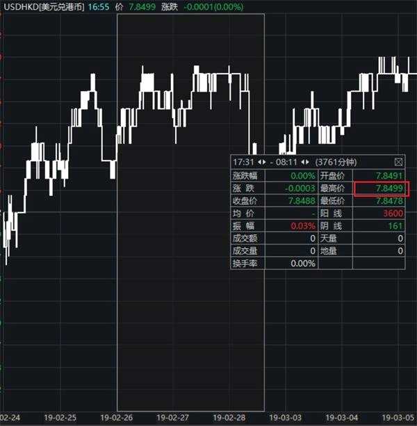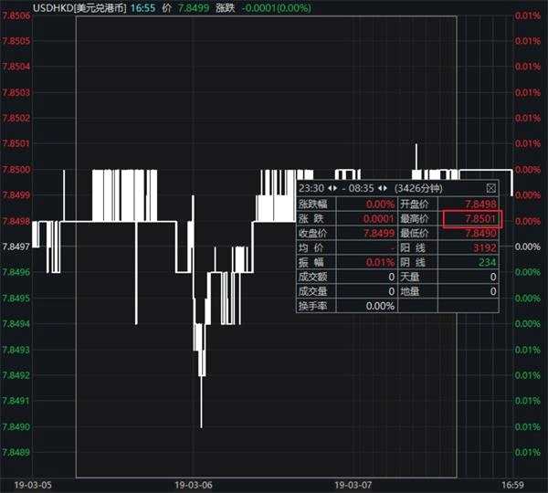 在3月9日上午7時前后,港元匯率維持在7.8499,距離7.85僅毫厘之間。