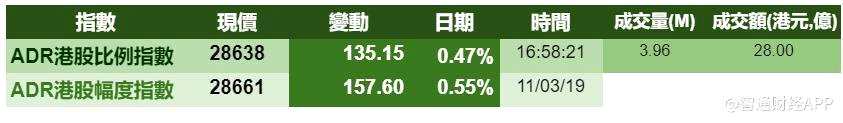 摘要: 獲悉,周一港股ADR指數(shù)全日跟隨美股走強(qiáng),按比例計(jì)算,收?qǐng)?bào)28638點(diǎn),升135.15點(diǎn)或0.47%。個(gè)別藍(lán)籌股出現(xiàn)下跌,如匯豐控股收?qǐng)?bào)64.38元,較香港跌0.10%,而騰訊收?qǐng)?bào)357.40,較香港