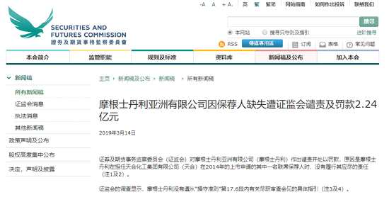 港證監(jiān):大摩因保薦人缺失遭港證監(jiān)罰款2.24億港元
