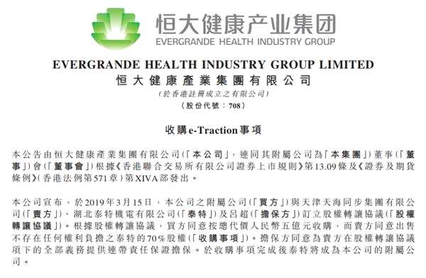 3月15日晚間,恒大健康(HK.0708)公告稱,以5億元收購泰特機電有限公司70%股份。泰特機電100%持有荷蘭e-Traction公司股份,擁有國際最先進的輪轂電機技術。這意味著恒大在新能源汽車領域完成了又一次重要布局,進一步打通了全產業(yè)鏈。