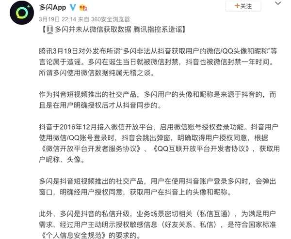 騰訊對(duì)外發(fā)布所謂多閃非法從抖音獲取用戶的微信/QQ頭像和昵稱等言論屬于造謠。