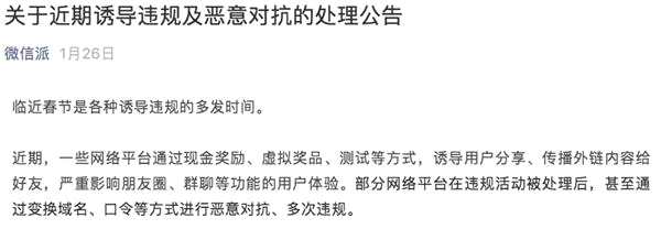 1月26日,微信官方發(fā)布了《關(guān)于近期誘導(dǎo)違規(guī)及惡意對(duì)抗的處理公告》:近期一些網(wǎng)絡(luò)平臺(tái)通過(guò)現(xiàn)金獎(jiǎng)勵(lì)、虛擬獎(jiǎng)品、測(cè)試等方式,誘導(dǎo)用戶分享、傳播外鏈內(nèi)容給好友,嚴(yán)重影響朋友圈、群聊等功能的用戶體驗(yàn)。部分網(wǎng)絡(luò)平臺(tái)在違規(guī)活動(dòng)被處理后,甚至通過(guò)變換域名、口令等方式進(jìn)行惡意對(duì)抗、多次違規(guī)。其中包括“今日頭條”、“火山視頻”、“西瓜視頻”、“網(wǎng)易云音樂(lè)”、“滴滴出行”、“趣頭條”等多款A(yù)pp。