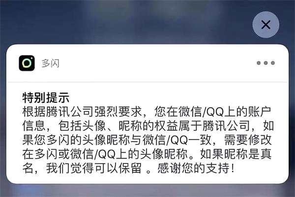 昨天下午,多閃APP向用戶發(fā)送彈窗消息稱:由于騰訊方面的要求,希望用戶修改在多閃或者微信上的賬戶頭像與昵稱。