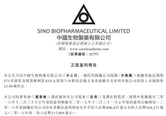 中國生物制藥發(fā)布公告,預期集團2018年度的盈利較2017年度的盈利大幅增加,2018年度歸屬于母公司持有者應占盈利增加至介于約人民幣89.08億元至約人民幣92.84億元(2017年度約人民幣21.7億元),同比增長約310.3%-327.6%。