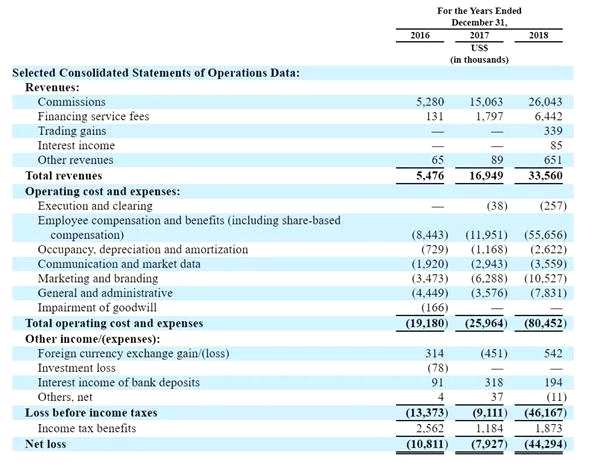 老虎證券IPO招股書顯示,公司2018年總收入為3356萬美元,同比增長98%。2016-2017年收入分別為547.6萬美元、1694.9萬美元。