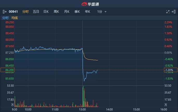 ︱業(yè)績不及市場預(yù)期 中移動(00941)午后開盤直線跳水現(xiàn)跌1.2%