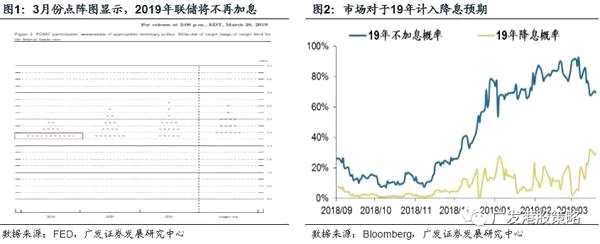 第一,利率政策上,美聯(lián)儲(chǔ)預(yù)計(jì)全年不加息,明年預(yù)計(jì)加息一次。本次會(huì)議聲明美聯(lián)儲(chǔ)繼續(xù)按兵不動(dòng),宣布將利率水平維持在2.25%-2.5%不變,符合市場(chǎng)預(yù)期。從點(diǎn)陣圖來(lái)看,2019年底聯(lián)邦基金利率料為2.4%,前值為2.875%;2020年底聯(lián)邦基金利率料為2.6%,前次預(yù)計(jì)為3.125%。點(diǎn)陣圖意味著19年聯(lián)儲(chǔ)在中止緊縮節(jié)奏上更為激進(jìn),顯示2019年將不再加息,基調(diào)上也明顯更加偏“鴿”。這和CME計(jì)入的19年大概率不加息的預(yù)期走勢(shì)吻合,進(jìn)一步確認(rèn)了年初以來(lái)美股和全球風(fēng)險(xiǎn)資產(chǎn)估值擴(kuò)張的邏輯。