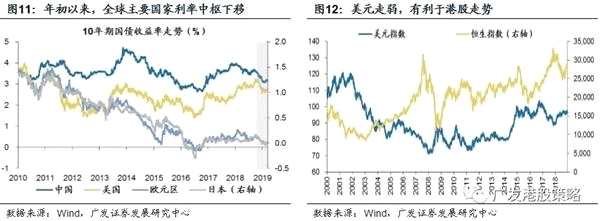 年初以來(lái),聯(lián)儲(chǔ)“轉(zhuǎn)鴿”,讓美債、匯率的“逆風(fēng)”不再?gòu)?qiáng)勁。我們?cè)?8年12月7日年度報(bào)告《漸入佳境》中提出,中美周期從分化到收斂、聯(lián)儲(chǔ)加息放緩,使得人民幣匯率貶值、美元走強(qiáng)、美債收益率上行壓力邊際減弱,19年港股估值將溫和擴(kuò)張。