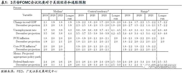 第三,經(jīng)濟(jì)前瞻方面,下調(diào)經(jīng)濟(jì)增長(zhǎng)、PCE通脹預(yù)期,上調(diào)失業(yè)率預(yù)期。本次FOMC的最新預(yù)測(cè)明顯下調(diào)了對(duì)于未來(lái)經(jīng)濟(jì)增長(zhǎng)和通脹的預(yù)期,2019年實(shí)際GDP增速預(yù)期從18年12月份的2.3%下調(diào)至2.1%,2019年P(guān)CE通脹預(yù)期從18年12月份的1.9%下調(diào)至1.8%;且上調(diào)了2019年失業(yè)率預(yù)期,從18年12月份的3.5%上調(diào)至3.7%。