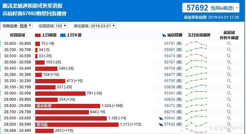 摘要: 獲悉,截至3月21日,恒指最新的牛熊街貨比例64:36。從瑞信恒指牛熊證街貨分布圖中得到的數(shù)據(jù)顯示,熊證街貨重貨區(qū)在29500-29599區(qū)間,該區(qū)間最新熊證數(shù)量為1313張,較上一交易日增加172張