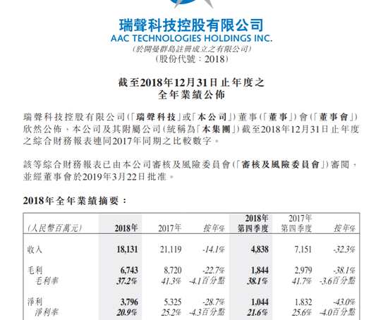 3月22日,瑞聲科技在港交所公布業(yè)績(jī),2018年全年?duì)I收181.3億元,同比降14.1%;全年凈利潤(rùn)38億元,同比降28.7%。