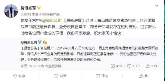 騰訊方面發(fā)布消息稱,經(jīng)過上海當(dāng)?shù)剡\(yùn)營商緊急搶修,光纖線路故障目前正逐步恢復(fù)。業(yè)務(wù)恢復(fù)正常中,部分產(chǎn)品可能存在短時(shí)波動(dòng)。