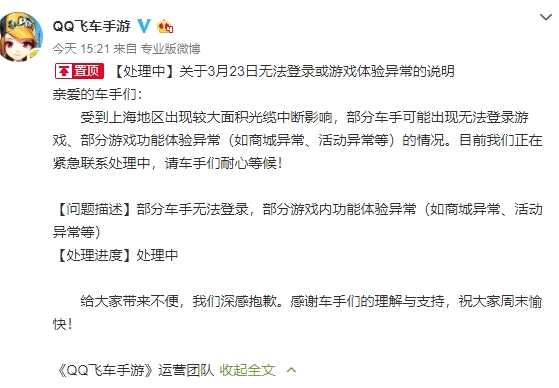 騰訊旗下QQ飛車于15時(shí)27分對(duì)外公告稱,受到上海地區(qū)出現(xiàn)較大面積光纜中斷影響,部分車手可能出現(xiàn)無法登錄游戲、部分游戲功能體驗(yàn)異常(如商城異常、活動(dòng)異常等)的情況。