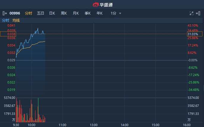 獲悉,嘉年華國際(00996)早盤逆市走強,升幅不斷擴大,截至10時24分,漲31.03%,報0.038港元,成交額達4446萬港元。