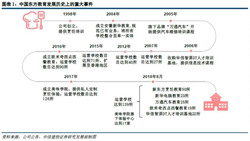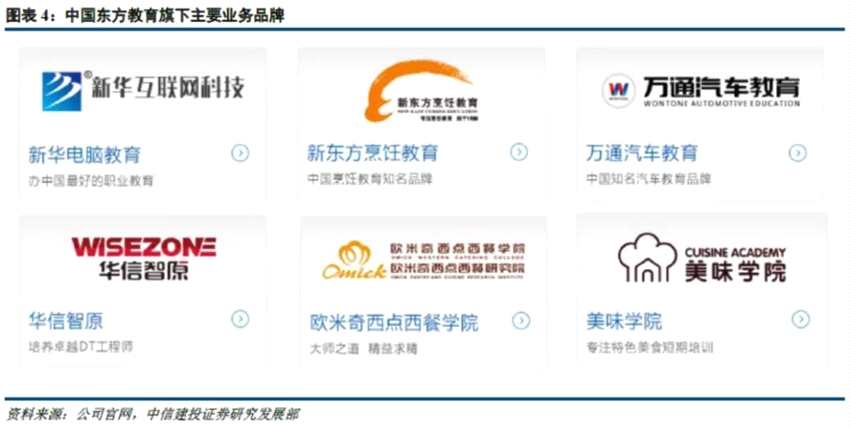 這家公司旗下有五大學(xué)校品牌,分別為新東方烹飪教育、歐米奇西點西餐教育、新華電腦教育、華信智原DT人才培訓(xùn)基地及萬通汽車教育。