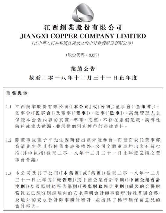 江西銅業(yè)股份:2018年凈利升52.43%至24.47億元