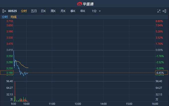 獲悉,廣深鐵路(00525)早盤平開后跳水走低,截至10時(shí)3分,跌6.45%,報(bào)3.19港元,成交額達(dá)1128萬港元。