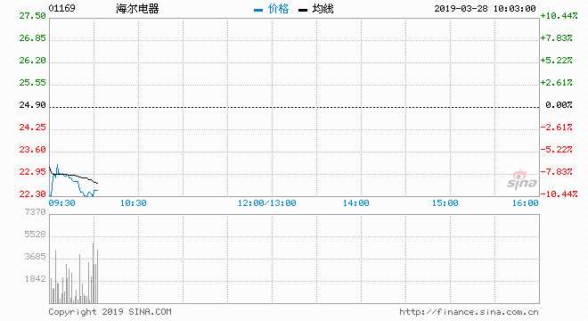 海爾電器 (01169) 23.00元 跌7.63%