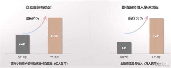 期內(nèi),移動POS服務由2017年的12.08億元增至2018年的25.86億元,同比增長114%,是驅(qū)動業(yè)績大幅增長的核心發(fā)動機,主要由于小微商戶支付交易量的迅速上漲。