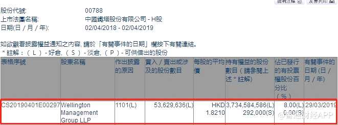 獲悉,根據(jù)聯(lián)交所資料顯示,威靈頓管理于3月29日增持中國鐵塔(00788)5362萬股,每股作價1.82港元,總值約9759萬港元,最新持股數(shù)目約37.34億股,最新持股比例增至8%。