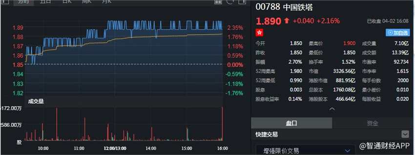 截至今日收盤,中國鐵塔(00788)漲2.16%,報1.89港元。