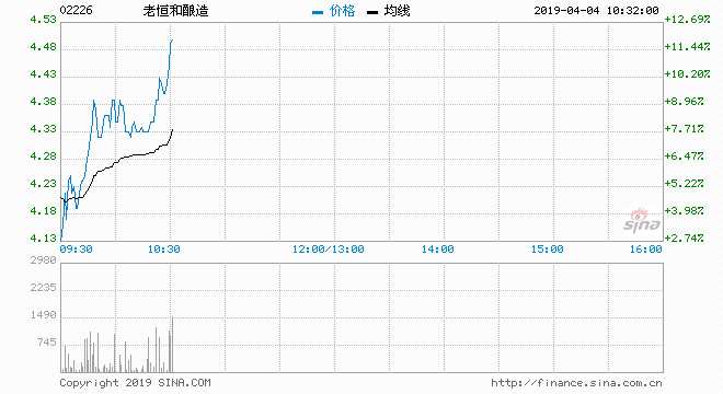 老恒和釀造(02226)報4.36元,升8.46%,盤中高見4.39元,創(chuàng)約兩年新高,暫成交達134萬股,涉資572萬元,主動買盤68%。