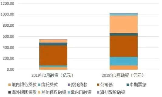 圖為2019年2月、3月典型上市房企融資情況對比,來源:同策研究院