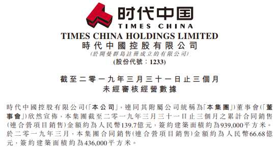 時(shí)代中國控股發(fā)布公告,集團(tuán)2019年首季累計(jì)合同銷售(連合營項(xiàng)目銷售)金額約為人民幣139.7億元,同比增長(zhǎng)29.6%,簽約建筑面積約為93.9萬平方米。