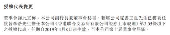 此外,公司副行長兼董事會秘書、聯(lián)席公司秘書王良已獲委任接替李浩擔(dān)任公司《香港聯(lián)合交易所有限公司證券上市規(guī)則》第3.05條項下的授權(quán)代表,任期自2019年4月8日起生效,至公司第十屆董事會屆滿。