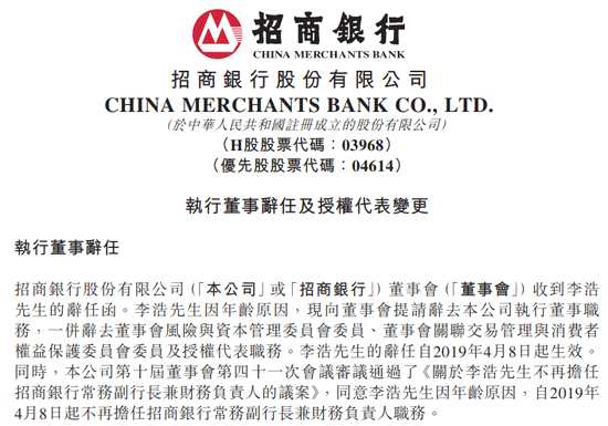 招商銀行:李浩辭任執(zhí)行董事等職務(wù)