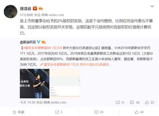 雷軍薪酬超小米公司一半?回應(yīng):股權(quán)獎(jiǎng)勵(lì)并未變現(xiàn)
