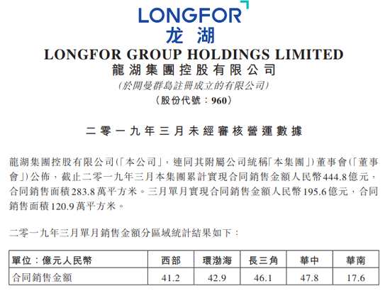 龍湖集團控股發(fā)布公告,截止2019年3月,該集團累計實現(xiàn)合同銷售金額人民幣444.8億元,合同銷售面積283.8萬平方米。