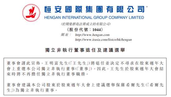 恒安國際發(fā)布公告,王明富將退任并決定不尋求在股東周年大會上重選公司獨立非執(zhí)行董事。因此,王明富于股東周年大會結(jié)束時將不再擔任獨立非執(zhí)行董事職務(wù)。