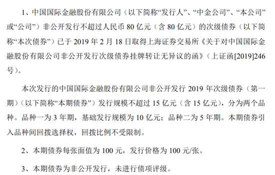 摘要: 中金公司發(fā)布公告,該公司擬于2019年4月18日發(fā)行2019年次級債券(第一期),發(fā)行規(guī)模不超過15億元(含15億元)。其中品種一3年期的基礎(chǔ)發(fā)行規(guī)模為10億元,品種二為5年期。