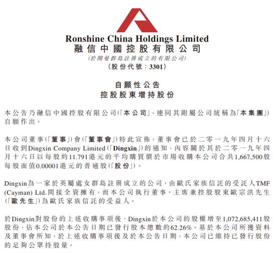 融信中國(guó): 控股股東Dingxin增持166.75萬(wàn)股至62.26%