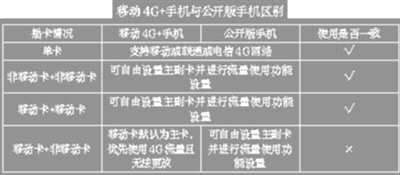 相對(duì)來(lái)說(shuō),移動(dòng)4G+版本的手機(jī)是手機(jī)廠商與中國(guó)移動(dòng)合作的定制機(jī)型。一位網(wǎng)友在相關(guān)網(wǎng)絡(luò)話題中談及移動(dòng)4G+時(shí)這樣介紹,“當(dāng)手機(jī)中沒(méi)有使用移動(dòng)卡的時(shí)候跟全網(wǎng)通機(jī)幾乎一樣,也支持多種網(wǎng)絡(luò),但手機(jī)中有一張移動(dòng)卡和一張非移動(dòng)卡的時(shí)候,會(huì)限定只可以使用移動(dòng)卡上網(wǎng),不能設(shè)置兩張SIM卡的流量切換。”