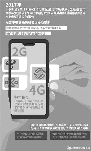其中提到,“用戶使用此類終端后,只要其中一個(gè)卡槽使用移動(dòng)卡,另一卡槽使用聯(lián)通或電信號(hào)卡只能使用2G網(wǎng)絡(luò),用戶會(huì)誤認(rèn)為是聯(lián)通或電信4G網(wǎng)絡(luò)信號(hào)問(wèn)題,勢(shì)必影響聯(lián)通或電信用戶對(duì)網(wǎng)絡(luò)和服務(wù)的感知;如果用戶堅(jiān)持使用聯(lián)通或電信號(hào)卡上網(wǎng),勢(shì)必增加換機(jī)成本,限制了全省廣大消費(fèi)者自由選擇通信產(chǎn)品與服務(wù)的權(quán)利”。