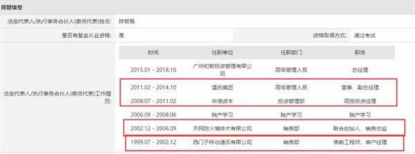 不過,和智投資創(chuàng)始人陳智鵬,可與叱咤一時的唐萬新不可同日而語。根據(jù)中國證券投資基金業(yè)協(xié)會信息顯示,其最后在西門子移動通訊擔任售前工程師、客戶經(jīng)理,一度參與創(chuàng)立天網(wǎng)防火墻。2008年開始任職于中信資本擔任高級投資經(jīng)理,后加入溫氏集團擔任副總經(jīng)理。