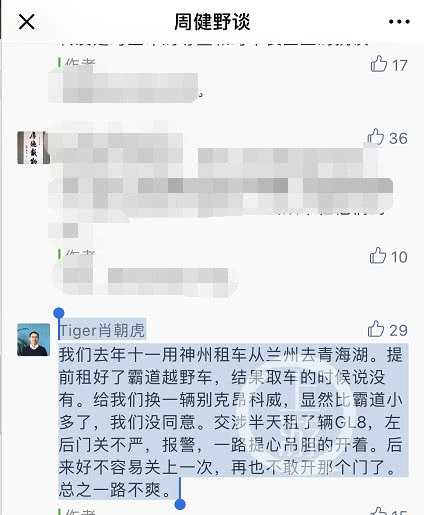 網(wǎng)友“Tiger肖朝虎 ”:我們?nèi)ツ晔挥蒙裰葑廛噺奶m州去青海湖。提前租好了霸道越野車,結(jié)果取車的時(shí)候說(shuō)沒(méi)有。給我們換一輛別克昂科威,顯然比霸道小多了,我們沒(méi)同意。交涉半天租了輛GL8,左后門(mén)關(guān)不嚴(yán),一路提心吊膽地開(kāi)著。后來(lái)好不容易關(guān)上一次,再也不敢開(kāi)那個(gè)門(mén)了。