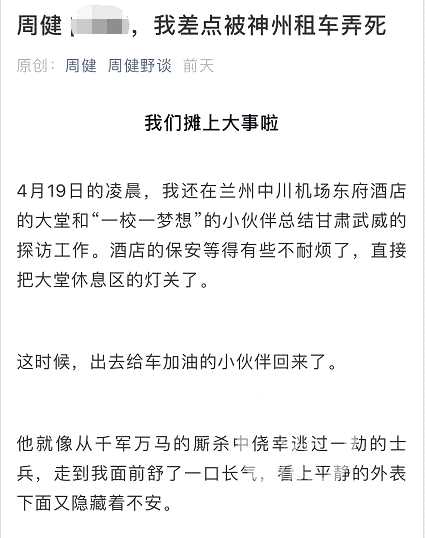 4月29日,周健將這段經(jīng)歷,以《我差點(diǎn)被神州租車弄死》為題發(fā)在微信公眾號(hào),不到24小時(shí),閱讀量超過(guò)3萬(wàn),網(wǎng)友紛紛留言講述自己在神州租車的不同遭遇。