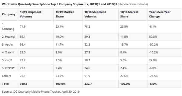 就整個(gè)行業(yè)背景而言,本季度是智能手機(jī)市場(chǎng)連續(xù)第六個(gè)季度銷量下滑——第一季度全球智能機(jī)出貨量為3.108億部,較上年同期的3.327億部下滑6.6%。在前五大廠商中,只有華為和vivo的智能機(jī)出貨量實(shí)現(xiàn)了同比增長。