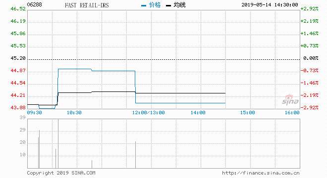 迅銷(06288)現(xiàn)挫2.54%,報(bào)44.05元,盤中低見43.9元,穿十天線(44.69元);成交約1萬股,涉資62萬元。