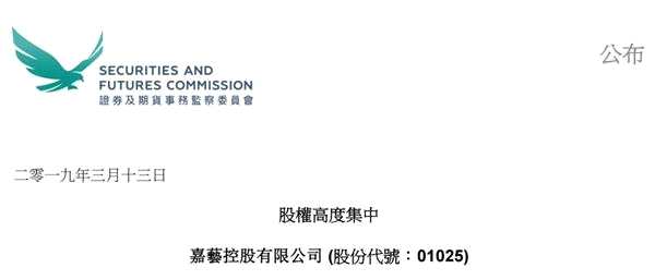 香港證監(jiān)會(huì)在3月份的時(shí)候指出,嘉藝控股股權(quán)高度集中。