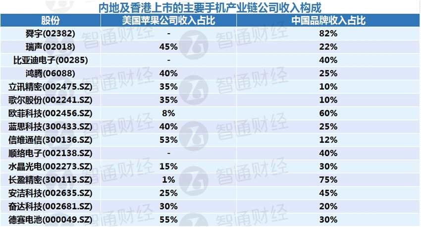 中金近日發(fā)表報告,列出內(nèi)地及香港上市的主要手機產(chǎn)業(yè)鏈公司收入構(gòu)成: