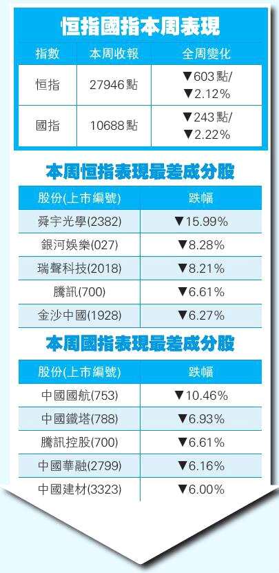 據香港商報記者吳天淇報道:貿易戰(zhàn)繼續(xù)發(fā)酵,人民幣兌美元挫至近半年低位,港股昨跟隨美股高開152點后隨即倒跌,收市報27946點,跌328點或1.1% ,失守28000點及250天線兩大關口,并創(chuàng)2月15日以來收市新低。國企指數收報10688點,跌122點或1.1%,主板全日成交1024億元。恒指本周于28000至28500點水平上落,全周累跌603點,跌幅2.1%。