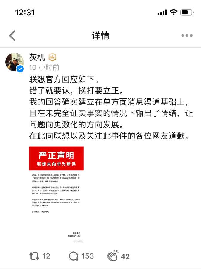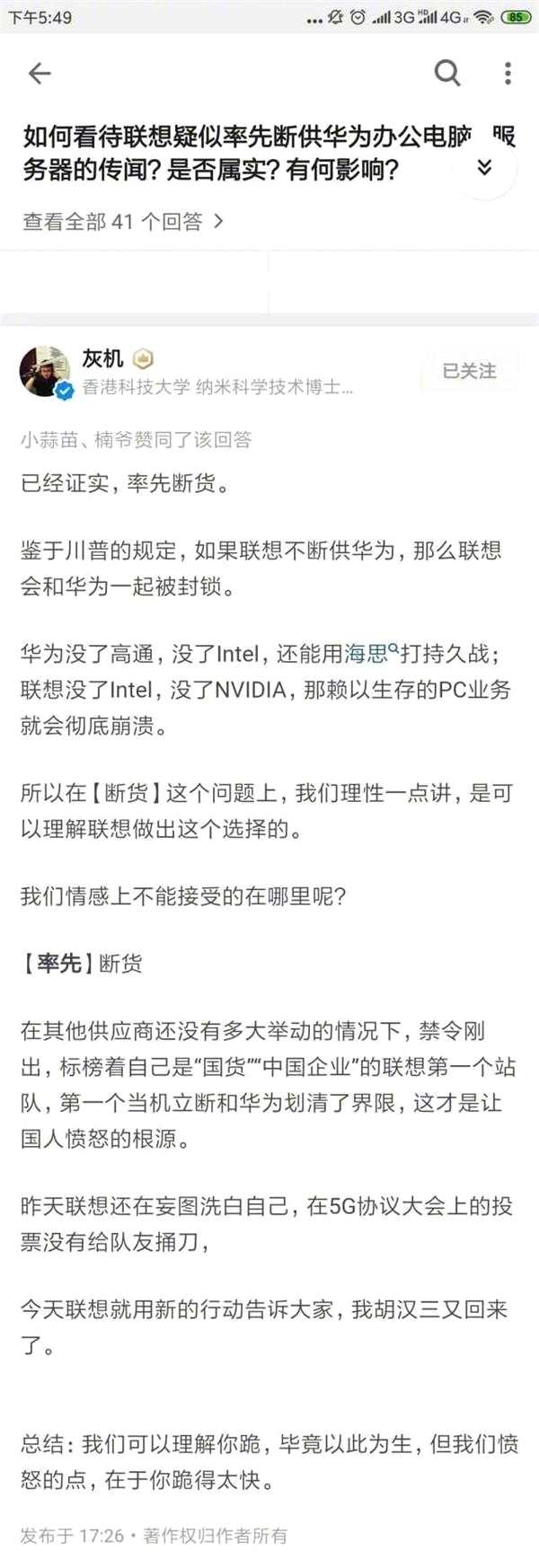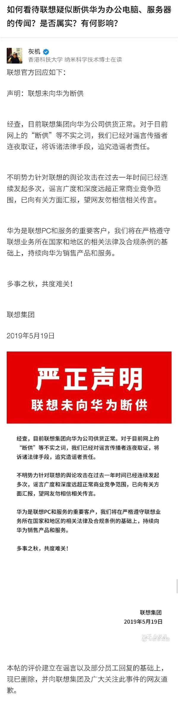 美國(guó)“封禁”華為一事發(fā)生后,有謠言傳出稱(chēng)聯(lián)想斷供華為,隨后知乎認(rèn)證為“香港科技大學(xué)、納米科學(xué)技術(shù)博士”的“灰機(jī)”發(fā)文稱(chēng)“已經(jīng)證實(shí),率先斷貨”,不過(guò)已經(jīng)證實(shí)的依據(jù)是什么,例如聊天記錄或相關(guān)的證明文件和國(guó)外權(quán)威媒體報(bào)道文中都沒(méi)提及。