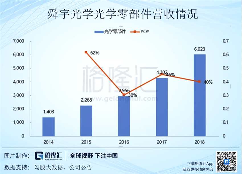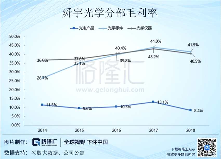2018年公司實(shí)現(xiàn)了259億元的營業(yè)收入,其中光電產(chǎn)品、光學(xué)零件和光學(xué)儀器各分部收入分別為196億元、60億元和3億元;占比分別為75.6%、23.2%和1.2%;毛利率分別為8.4%、41.5%和40.5%。光電產(chǎn)品也就是其模組產(chǎn)品貢獻(xiàn)了營收的最大部分,雖然其光學(xué)產(chǎn)品也就是鏡頭產(chǎn)品的營收整體占比不高,但憑借著光學(xué)產(chǎn)品高達(dá)41.5%的毛利率,對于整體毛利的貢獻(xiàn)超過了模組產(chǎn)品的毛利。