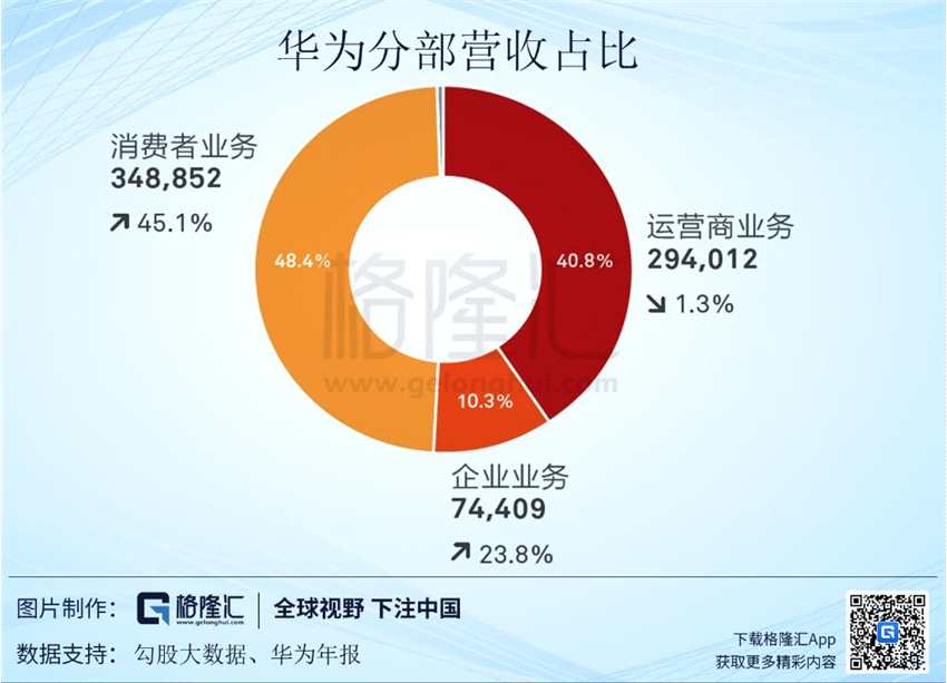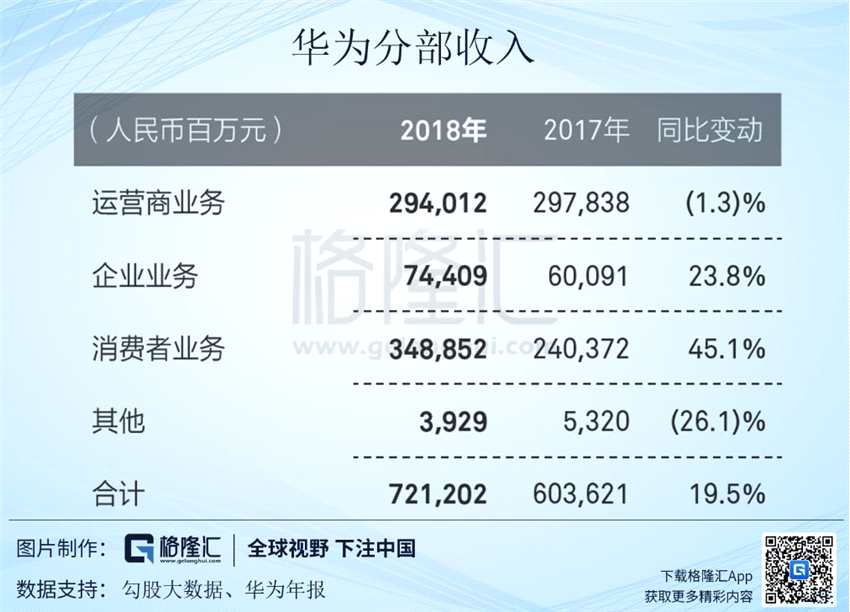 2018年,華為全年實(shí)現(xiàn)銷售收入人民幣721,202百萬元,同比增長19.5%。其中消費(fèi)者業(yè)務(wù)也就是智能手機(jī)業(yè)務(wù)營收為348,852百萬元,占比達(dá)到48.4%,已經(jīng)超過運(yùn)營商業(yè)務(wù)成為華為的第一大業(yè)務(wù)。