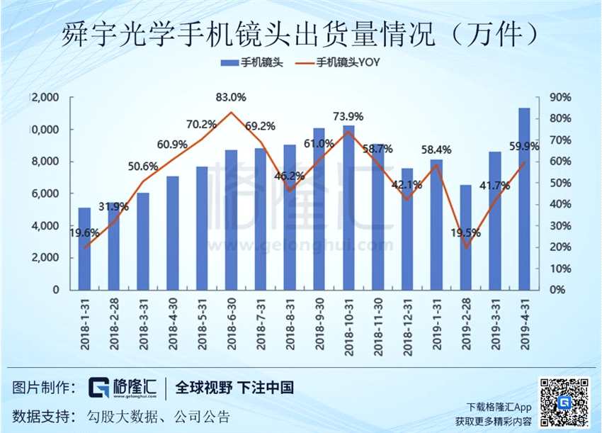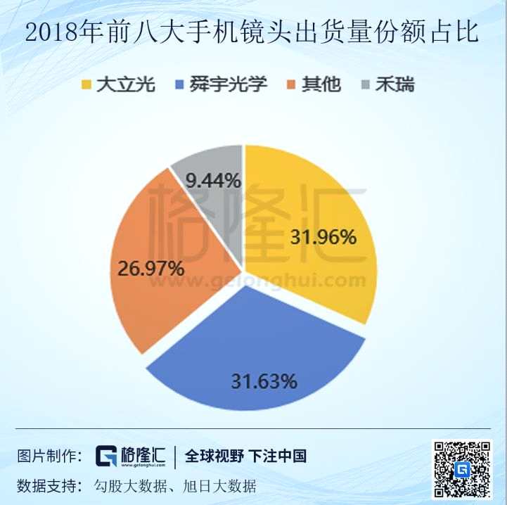 在2018年全球智能手機(jī)出貨量同比下滑4.1%的情況下,舜宇光學(xué)仍然保持住了一個(gè)逆勢強(qiáng)力增長的勢頭。占據(jù)了全球前八大手機(jī)鏡頭出貨量的31.63%和全球智能手機(jī)鏡頭出貨量的20%以上。進(jìn)一步的拉近了與臺灣對手大立光的差距。
