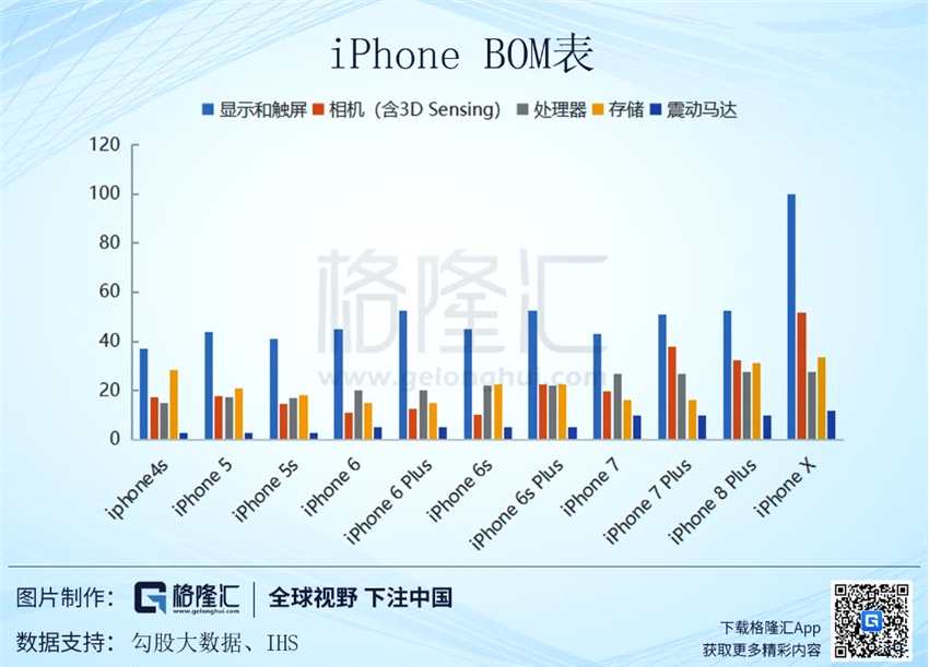 在整個(gè)手機(jī)產(chǎn)業(yè)鏈中,光學(xué)創(chuàng)新就像一部高速上升的電梯。與此同時(shí),手機(jī)品牌之間競爭激烈,攝像頭規(guī)格升級仍是搶奪市場的不二法寶。大光圈、廣角、超小型化、多攝及3D應(yīng)用等高端復(fù)雜的規(guī)格紛紛應(yīng)用于中國智能手機(jī)品牌中。我們從歷代iPhone零部件成本當(dāng)中,可以看出手機(jī)單機(jī)的價(jià)值中,光學(xué)是僅次于顯示和觸屏的成本。